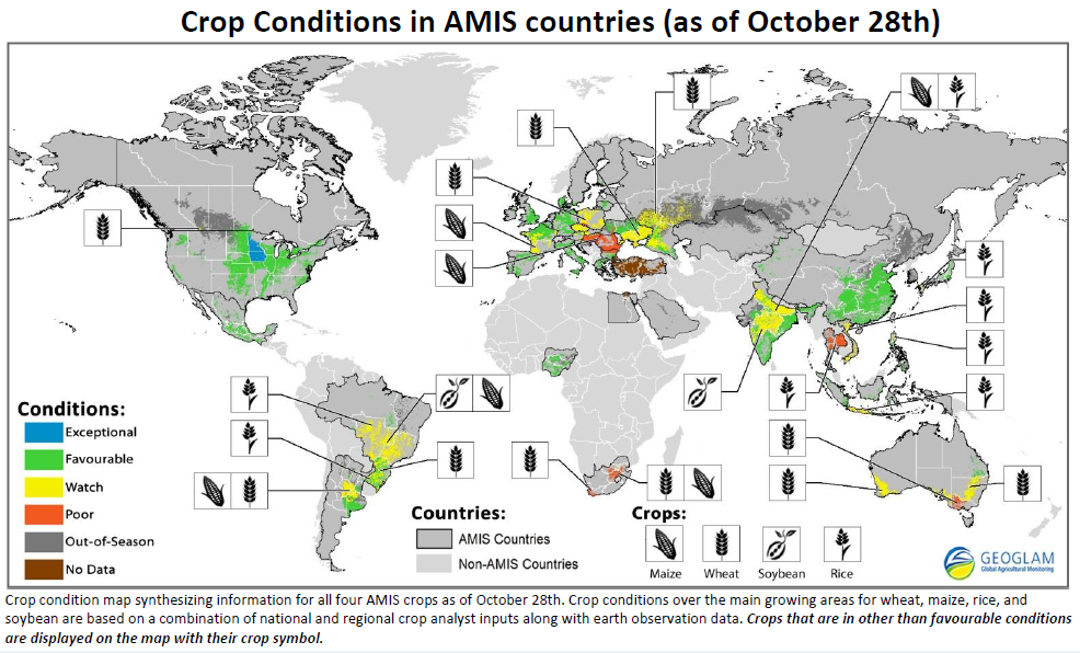 Even though it raised its forecast for global wheat production, FAO's Cereal Supply and Demand Brief reduced its overall global cereal production estimates for October to 2.53 billion tons (1.1 percent below last year's record output). Half of the cut in cereal production estimates is attributable to reduced expectations for maize crops in India and Ukraine, primarily due to adverse weather, while drought in Thailand prompted a reduction in the seasonal rice harvest projection. Still, world cereal stocks are expected to remain at a comfortable level, with global wheat inventories rising to their highest level in 15 years.