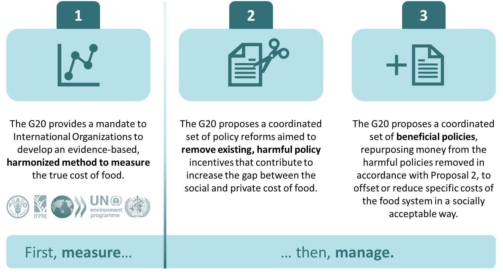 Three Proposals for G20 Action To begin the process, the G20 must give a mandate to the international scientific community, including organizations such as the UN Food and Agriculture Organization (FAO), the Organization for Economic Cooperation and Development (OECD), IFPRI, the UN Environment Programme (UNEP), the World Health Organization (WHO), and the Meetings of Agricultural Chief Scientists of G20 States (MACS-G20), to develop a harmonized method to measure the true cost of food. This method could be a central contribution to the United Nations Food System Summit in 2021 if it is consistent, evidence-based, and robust across countries and food products. The international scientific community will be able to use this measurement method to assess the relative magnitude of various social costs of food and to identify key policy types that contribute to food systems’ “hidden” costs. The G20 can then use this assessment to coordinate policy reforms aimed at removing harmful policy incentives that increase the social cost of food, and to propose beneficial policies that offset or reduce specific food system costs in socially acceptable ways. G20 member countries could repurpose money from the harmful policies removed in accordance with Proposal 2 for the beneficial policies in Proposal 3. By establishing a clear understanding and measurement of the true cost of food, including all market failures, countries will be better able to design and repurpose their current agricultural policies to achieve a triple win: improved productivity, resilience, and environmental stability.