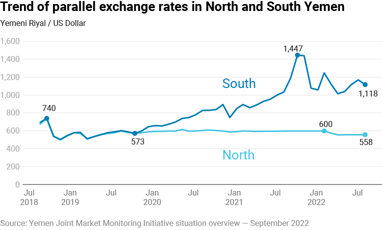 Food importing companies in both North and South also face the complications of procuring foreign exchange to purchase in the international market. Each country part has separate monetary policies regarding the national currency—the Yemeni riyal (YER)—with more recent banknotes printed in the South not accepted in the North. The official exchange rate is overvalued, and importers must compete in an auction system to access foreign exchange at the Central Bank. In the South, the currency has been steadily depreciating overall while jumping unpredictably as government deficits climb and reserves dwindle amidst occasional bailouts from Saudi Arabia (Figure 2).