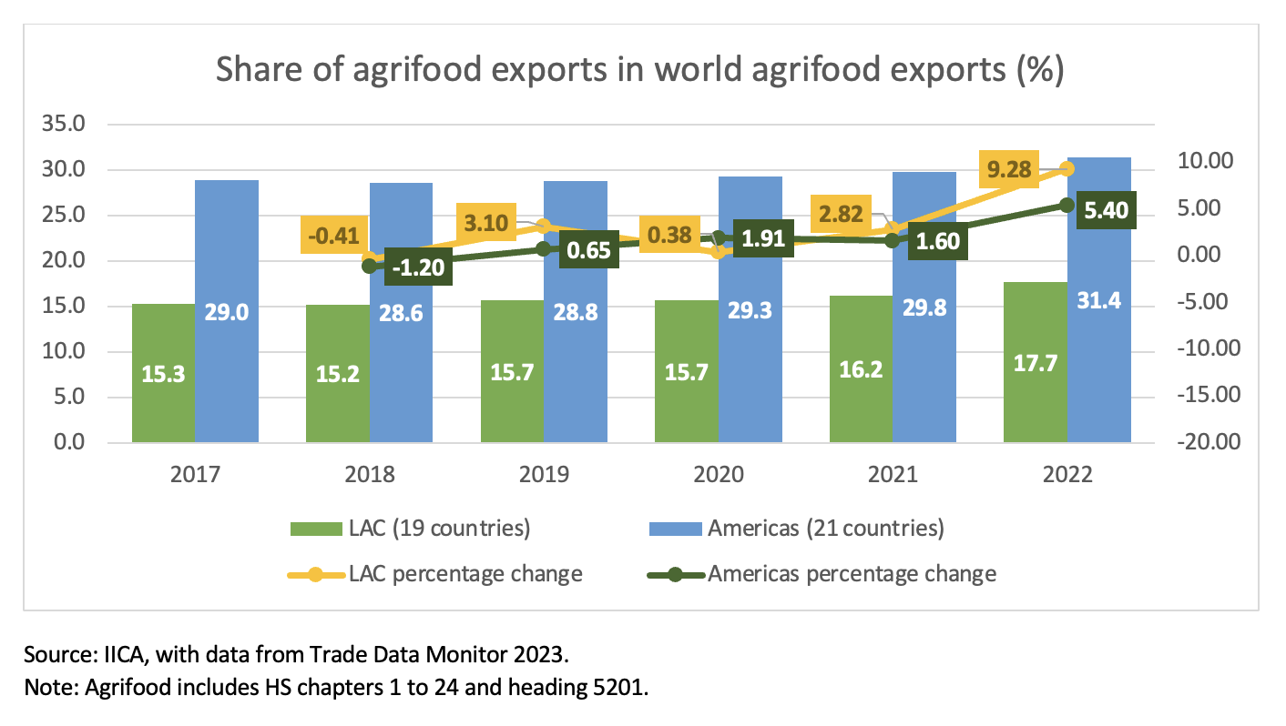 Latin America plays a major role in global food production and trade, and many countries in the region are eager to deepen agricultural reform. In 2022, the combined agrifood exports of 19 Latin American countries1 accounted for 17.7% of the world total. When combined with those of the United States and Canada, the Americas as a whole accounted for 31.4% of global agrifood exports (Figure 1).