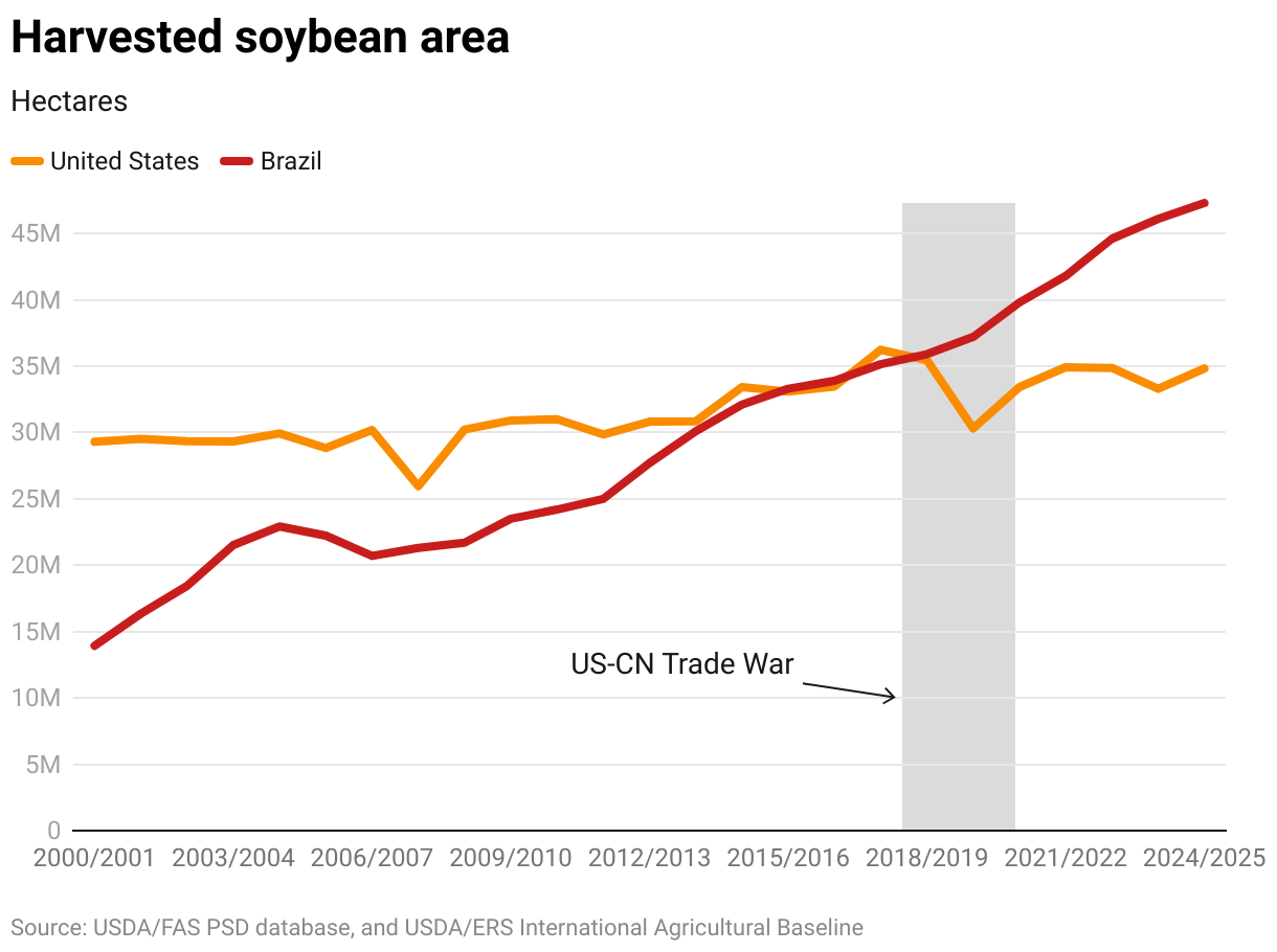 Between 2018 and 2020, Brazilian soybean area increased by almost 4 million hectares—more than 10%—in part driven by higher prices due to the U.S.-China trade war (Figure 7). By contrast, counter-retaliatory tariffs and the loss of the China market caused U.S. soybean prices to fall and soybean area dropped 5 million hectares (more than 14%) from 2018 to 2019 (recovering marginally in 2020)