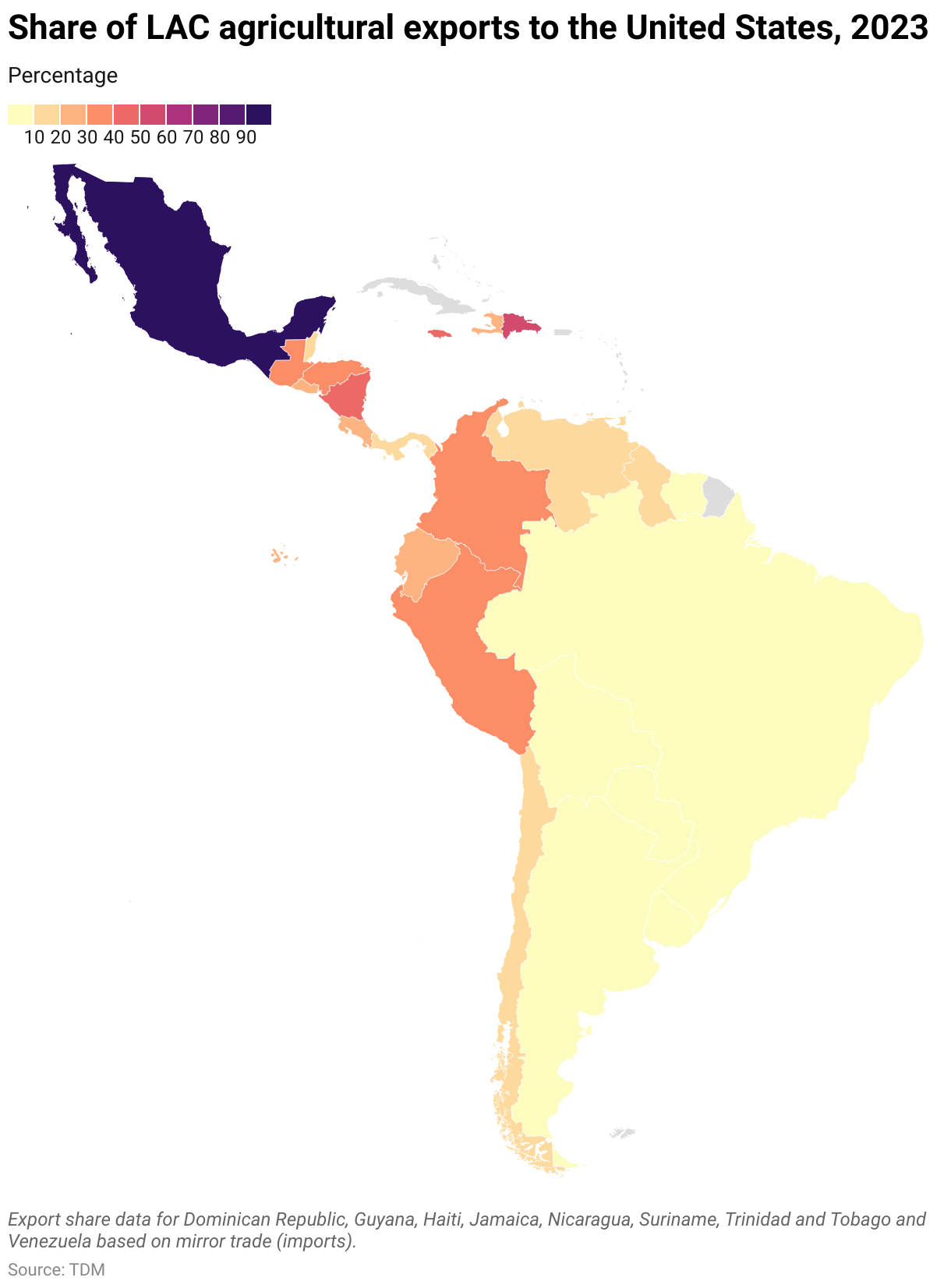 Dependence on the U.S. market varies widely among LAC markets (Figure 3). Mexico is by far the most vulnerable among LAC exporters—almost 92% of Mexico’s agricultural exports went to the United States in 2023. Dependency on the U.S. market is quite high for other countries with FTAs as well: Dominican Republic (58%), Nicaragua (43%), Colombia (40%), Peru (35%) and Chile (19%).