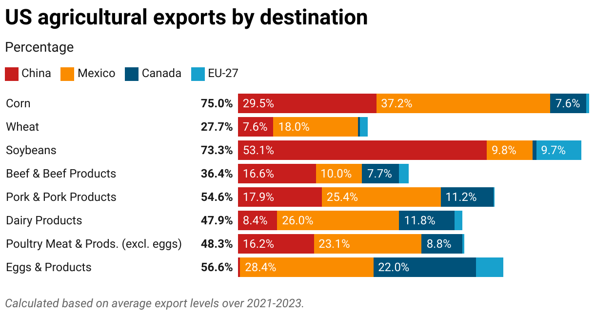 Canada, China, Mexico, and the EU are important destinations for many U.S. agricultural exports (Figure 5). For example, over 75% of U.S. corn exports, 73% of U.S. soybean exports and 55% of U.S. pork exports went to these four markets during 2021-2023. Counter-retaliatory tariffs could open export opportunities for countries such as Brazil (corn, soybeans, pork, beef and poultry), Argentina (corn, wheat, soybeans, beef) and Uruguay (dairy).