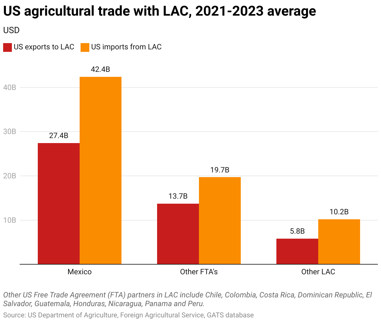 The United States imported more than $72 billion of agricultural products from LAC from 2021-2023 (Figure 2). Agricultural imports from Mexico predominate, accounting for $42 billion. Imports from other LAC countries with which the U.S. has free trade agreements (FTAs) totaled $15 billion over the same period (those countries include Chile, Colombia, Costa Rica, Dominical Republic, El Salvador, Guatemala, Honduras, Nicaragua, Panama, and Peru).