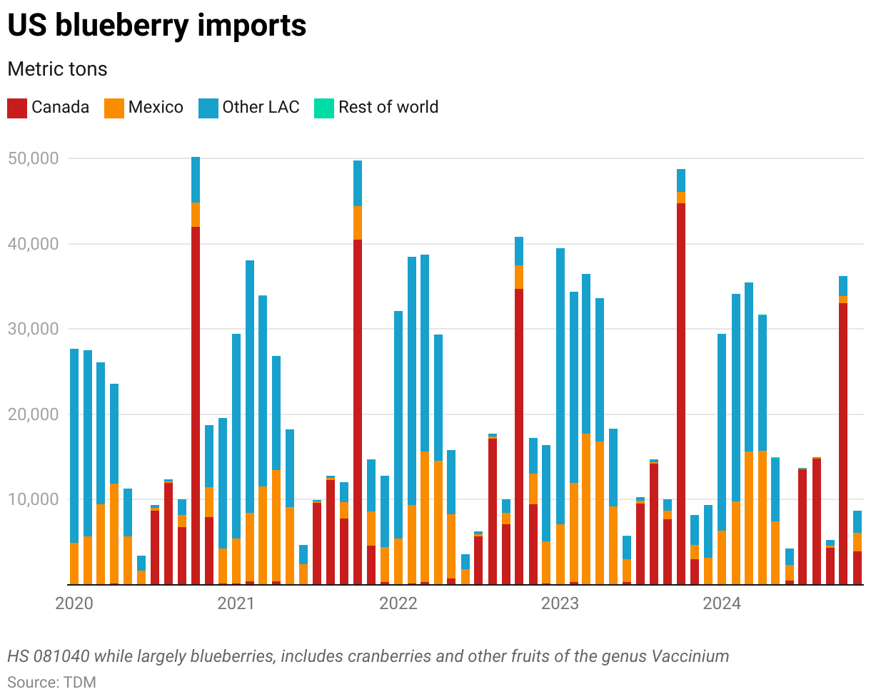 Consider blueberries. U.S. blueberry imports in 2023 were $1.8 billion, about $700 million from Mexico and Canada. Imports from Peru and Chile totaled over $870 million and about $200 million, respectively (Figure 4). If high tariffs reduce Mexican imports, the loss could be partially offset by imports from Peru and Chile. But that in turn would have broader impacts, as those countries would end up diverting blueberries to the U.S. from other markets (for example, the European Union)—as it is difficult to increase relative supplies in the short run. (It normally takes three or more years to bring a blueberry plant to full maturity.)