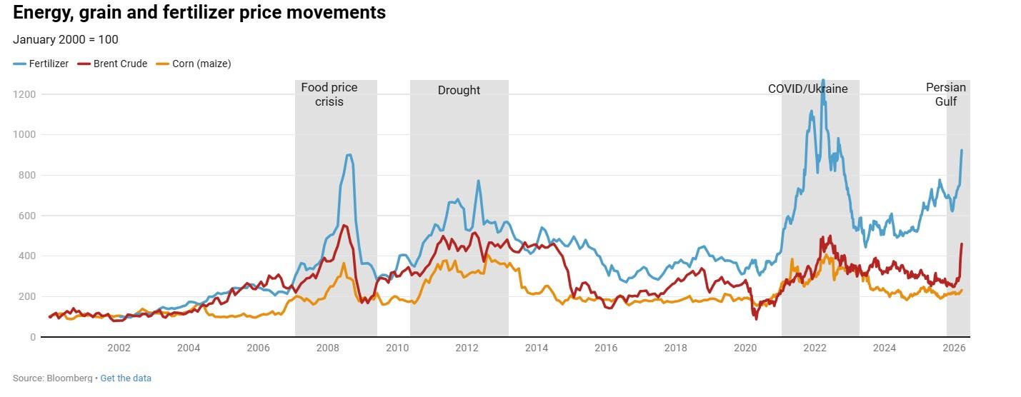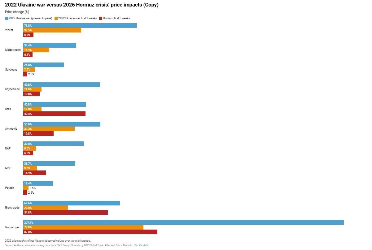 - Fertilizer and energy, not food, are the core shocks. The Hormuz closure is disrupting energy and fertilizer shipments and driving up prices, but grain markets remain stable.