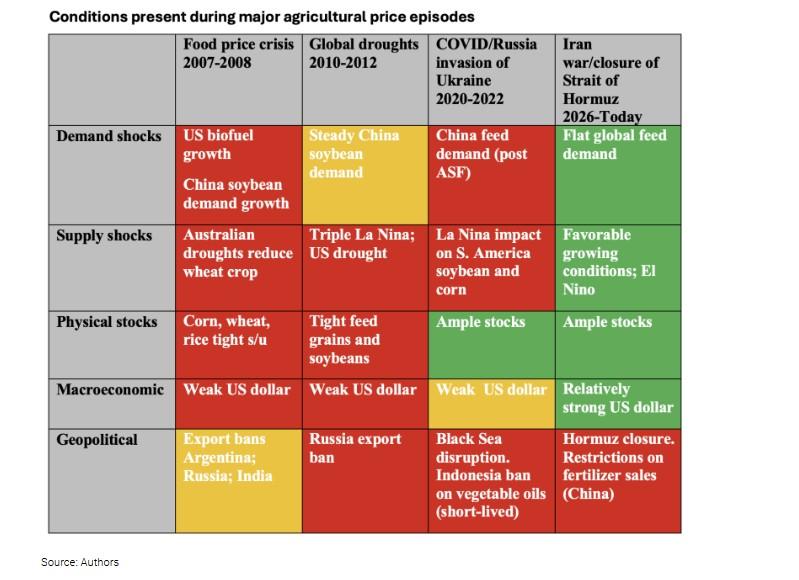 Are we at the beginning of another period of high food prices? The short answer, in our assessment, is probably not—at least not yet. The conditions that drove prior price spikes are largely absent today, and the Hormuz disruption is a fundamentally different kind of shock than either the 2007-2008 food price crisis or 2022. The Hormuz disruption is a fertilizer supply shock, not a crop supply shock, and that distinction matters both in price formation and appropriate policy responses.