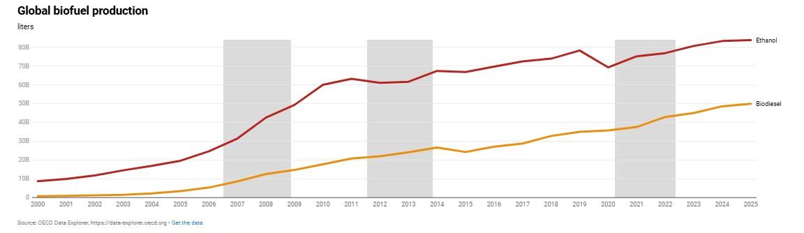 The 2007-2008 food price crisis was driven in large part by the U.S. mandate requiring minimum levels of ethanol in fuels, which created roughly 100 million MT of new annual maize demand (Figure 3). By 2011, that structural shift had been absorbed—U.S. ethanol production plateaued after 2010. Today, global biodiesel and ethanol volumes are growing, but this represents incremental demand, not a step-change comparable to the U.S. ethanol surge of 2006 to 2011.