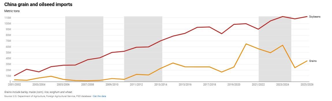 Brazil’s agricultural expansion has fundamentally altered the dynamics of commodity price cycles. Its soybean production has tripled in two decades, from roughly 52 million MT in 2002/03 to a projected 180 million MT in 2025/26. Exports have grown proportionally. Brazil now accounts for approximately 60% of global soybean trade, up from about 33% during the 2006–08 crisis.