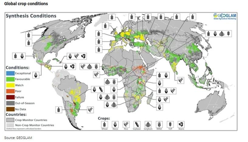 By contrast, early-season crop conditions for the upcoming growing season in the Northern Hemisphere look favorable. In its latest Crop Monitor, GEOGLAM rates 17 of 22 major region-crop pairs as favorable or exceptional (Figure 5). The U.S. National Oceanic and Atmospheric Administration reports a 62% probability of an El Niño event developing by mid-2026. Historically, El Niño events have significantly affected wheat, maize, rice, and soybean yields on every continent, although the impact is not always negative, and yield impacts in one region (e.g., South American maize production) may be offset by yields in another region (e.g., North America). At this point, yield impacts are very much uncertain, as much will depend on the duration and strength of the El Niño event.