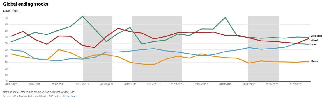 - Classic food price‑spike conditions are absent. Strong demand, tight stocks, weak dollar, and weather shocks aren’t aligning as in past crises.