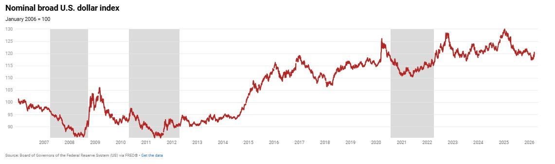 Each of the three prior rallies coincided with a weak dollar. The nominal broad dollar index (DXY) hit its all-time low of roughly 71 during the 2007-2008 food price crisis, fell to about 73 during the 2010- 2012 drought rally, and troughed near 89 in 2021 just prior to the surge of prices in the second half of 2021 and 2022. The dollar strengthened relative to other currencies from 2021 through late 2024 and despite declining somewhat in 2025, the DXY currently sits near 99-100. A weak dollar tends to be strongly correlated with higher commodity prices, in part, due to the fact that internationally-traded commodities are dollar-denominated. A sustained weakening of the dollar would be among the most powerful catalysts for a rise in commodities prices, but there is no clear indication of one at present.